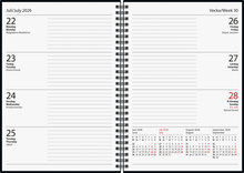 En tydlig och enkel kalender med gott om plats för anteckningar. Storlek 130 x 185 mm. Spiralbundet kartongomslag med elastisk snodd. En vecka per uppslag. Kalendariet vecka 30/2025-31/2026. Särskilda sidor för månadsplanering, namnsdagar, flaggdagar. Årsöversikt 2025-2026. Sidor för schema. FSC®-certifierad produkt